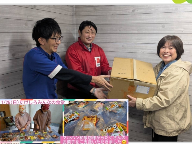 マルハン和泉店がお客様より寄付して頂いた端玉お菓子を「原山子ども食堂」様に寄付させて頂きました。
