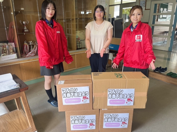 マルハン青森下田店がおいらせ町にある「木ノ下小学校」さんへプルタブ・エコキャップ・使用済切手・使用済インクの寄付をしてきました。
