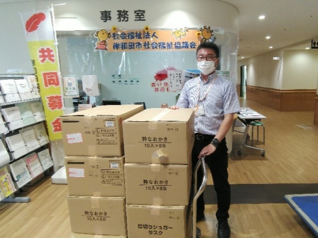 マルハン岸和田店がお客様よりご提供頂いた端玉のお菓子を「岸和田市社会福祉協議会」様へお渡ししました。