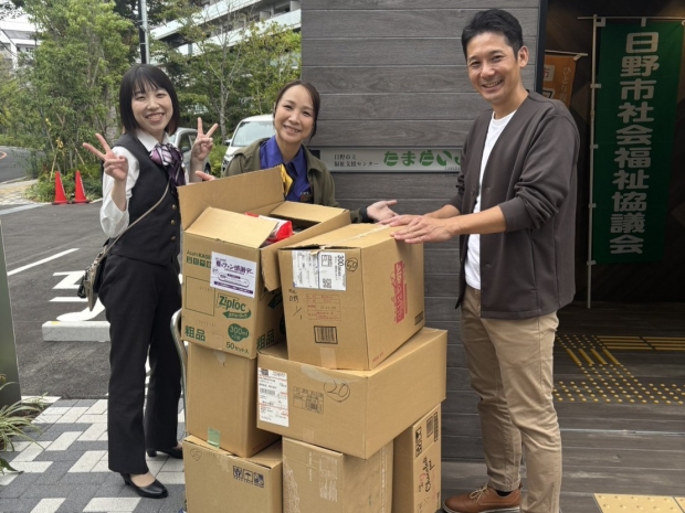 マルハン日野店がお客様のご厚意で寄付して頂いたお菓子や飲み物などを「日野市社会福祉協議会ボランティアセンター」へ届けました。